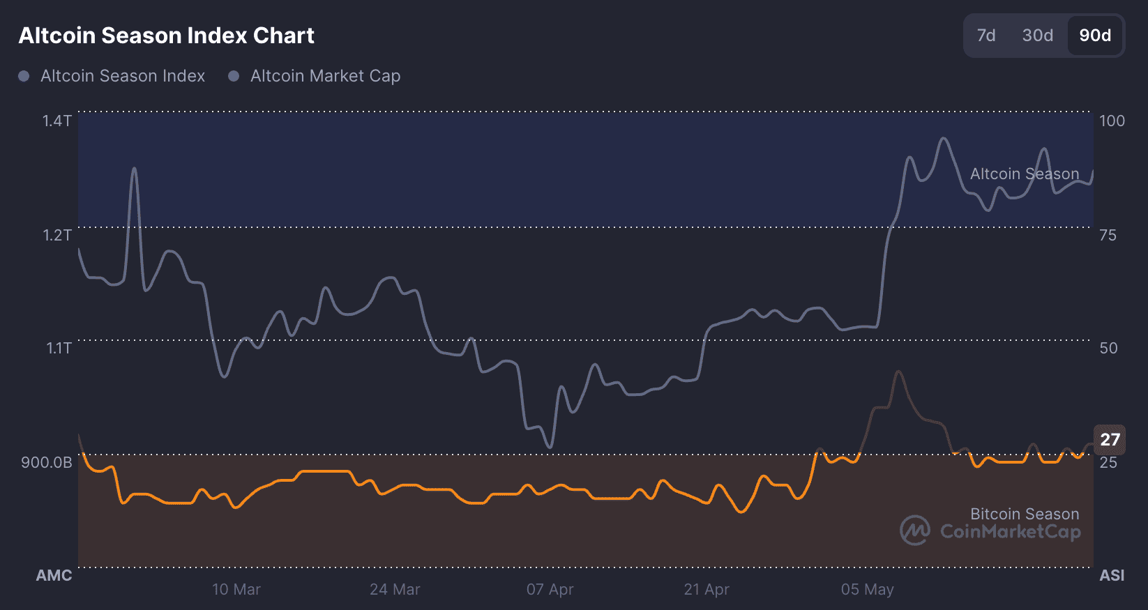 The Alt season Index is a certain indicator, the value of which can reflect where the market is headed. It is calculated as follows. The top 100 Altcoins are selected based on indices, trends, capitalization, etc. Then they are compared with Bitcoin. If > 75% of them demonstrate significantly higher growth, this indicates an Alt season. If < 25%, on the contrary, it is a Bitcoin season. In the picture below, this indicator = 27, which means there's the BTC dominance zone. You can follow the current season index on CoinMarketCap.
