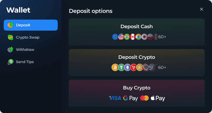The main methods for depositing fiat include Skrill, Neteller, PIX, and SPEI. All the new currencies are linked to the country you specified during registration. So, your account balance will display the national currency, but you can change it in settings.