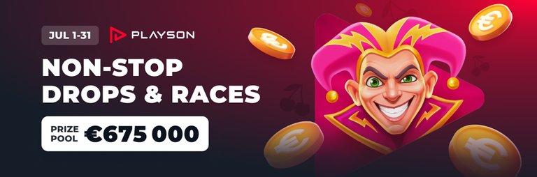 Endless wins, endless profit! Join the €675,000 Non-Stop Drops & Races by Playson until July 31. Play energetic games to multiply your crypto with no break!